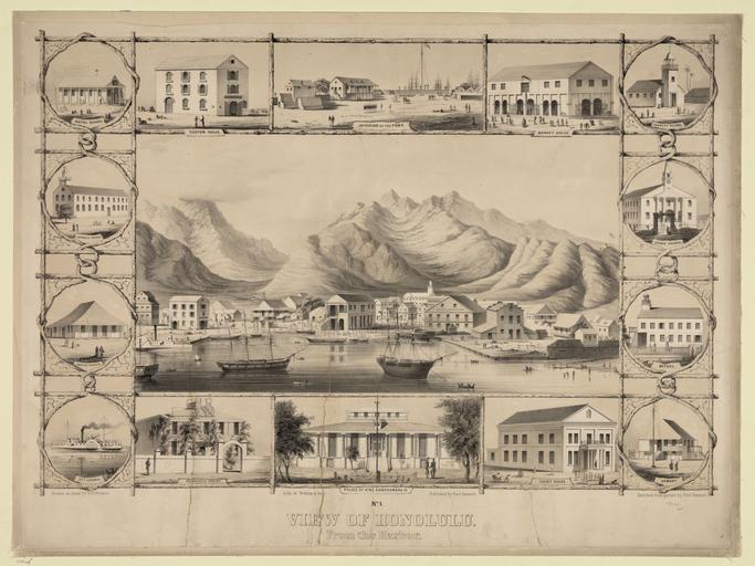 Keywords: No. 1. View of Honolulu. From the harbor. (c. 1854).jpg LargeImage George Henry Burgess ; lithographed by Britton Rey; sketched from nature and published by Paul Emmert Creator George Henry Burgess Creator Paul Emmert A drawing of views of clockwise from top left the w Royal School Hawaii Royal School Custom House interior of the Fort market house charity school stone church Bethel Bethel Church armory court house palace of King Kamehameha III Honolulu House the steamer Akamai the native church and the Catholic church cite news Warren Goodale 10 Honolulu in 1853 Papers of the Hawaiian Historical Society Hawaiian Historical Society 1897 http //hdl handle net/10524/969 ca 1854 Lithography Lithograph one tint stone With text cm 51 2 69 3 ; without text cm 46 7 69 3 Institution Library of Congress Prints and Photographs Division <br> Washington D C United States accession number Call number PGA - Britton Rey--No 1 View of Honolulu D size P P; reproduction numbers LC-DIG-pga-00315 digital file from original print LC-USZ62-52238 b w film copy neg object history Published in San Francisco by Paul Emmert credit line Drawn on stone by G H Burgess / Lith of Britton Rey / Published by Paul Emmert / No 1 VIEW OF HONOLULU From the Harbor http //www loc gov/pictures/item/2003681551/ http //lcweb2 loc gov/service/pnp/pga/00300/00315v jpg cph 3b00222 other versions 100x100px No 1 View of Honolulu From the harbor c 1854 copy negative version jpg PD-Art-100 derivative works View of Honolulu Harbor and Punchbowl Crater c 1854 jpg Paul Emmert George Henry Burgess Hawaii in drawings 1853 in Hawaii Historical images of Honolulu Hawaii |