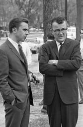 Keywords: blackandwhite people monochrome outdoor black and white On June 26, 1963, the North Carolina General Assembly passed the Act to Regulate Visiting Speakers, later known as the Speaker Ban Law. The law forbade anyone to speak on a University of North Carolina campus who was a known member of the Communist Party, was known to advocate overthrow of the United States Constitution, or had invoked the Fifth Amendment in respect of communist or "subversive" connections. The law was rushed through in the closing hours of the legislative session with virtually no debate. Governor Terry Sanford was against the Speaker Ban bill, but at that time the governor of North Carolina could not veto legislation. In the wake of the passage of this law, the communities on the UNC campuses rose up in protest. Students, faculty, and community members protested the law and what it represented over the course of the next several years. A number of complex issues involving many key North Carolina political figures and national leaders kept the controversy very active and widely debated through the mid-1960's. In 1965, the North Carolina General Assembly established a commission to look into the consequenses of the law and recommend either ammedment or repeal of the law. The commission held public hearings in August and September of 1965 and in November amended the law absolving the state legislature from having to make rulings on who could speak on campuses and who could not and returning effective control over those issues to the universities. (Speaker Ban Law Study Commission records are held by the State Archives of North Carolina; finding aid is online www.archives.ncdcr.gov/findingaids/pdf/sa_speaker_ban_law...). In 1966 students at the University of North Carolina at Chapel Hill led by Student Body President Paul Dickson invited Herbert Aptheker and Frank Wilkinson ('known' Communists) to speak on the campus. As expected, the university refused to allow either of the speakers to give their speeches on campus. Instead, they addressed the assembled crowd on March 2, 1966, from across the stone wall that separates the university from the town of Chapel Hill. Ultimately a federal law suit against the university and the State of North Carolina was filed by UNC students. On February 19, 1968, after two years of consideration by the Federal District Court in Greensboro, Dickson, et al. v Sitterson, et al. was decided for the plaintiffs -- the court's opinion found the Speaker Ban law and policy unconstitutional. For more information on the Speaker Ban Law, its complexities, and surrounding events, please see this online exhibit and collection www.lib.unc.edu/mss/exhibits/protests/ban.html, NCpedia entry ncpedia.org/speaker-ban-law, and www.northcarolinahistory.org/commentary/187/entry/, used in the drafting of the above description of this set of images. COPYRIGHTED BY THE RALEIGH NEWS AND OBSERVER NEWSPAPER. DO NOT USE OR PUBLISH WITHOUT EXPRESSED CONSENT FROM THE N&O. On June 26, 1963, the North Carolina General Assembly passed the Act to Regulate Visiting Speakers, later known as the Speaker Ban Law. The law forbade anyone to speak on a University of North Carolina campus who was a known member of the Communist Party, was known to advocate overthrow of the United States Constitution, or had invoked the Fifth Amendment in respect of communist or "subversive" connections. The law was rushed through in the closing hours of the legislative session with virtually no debate. Governor Terry Sanford was against the Speaker Ban bill, but at that time the governor of North Carolina could not veto legislation. In the wake of the passage of this law, the communities on the UNC campuses rose up in protest. Students, faculty, and community members protested the law and what it represented over the course of the next several years. A number of complex issues involving many key North Carolina political figures and national leaders kept the controversy very active and widely debated through the mid-1960's. In 1965, the North Carolina General Assembly established a commission to look into the consequenses of the law and recommend either ammedment or repeal of the law. The commission held public hearings in August and September of 1965 and in November amended the law absolving the state legislature from having to make rulings on who could speak on campuses and who could not and returning effective control over those issues to the universities. (Speaker Ban Law Study Commission records are held by the State Archives of North Carolina; finding aid is online www.archives.ncdcr.gov/findingaids/pdf/sa_speaker_ban_law...). In 1966 students at the University of North Carolina at Chapel Hill led by Student Body President Paul Dickson invited Herbert Aptheker and Frank Wilkinson ('known' Communists) to speak on the campus. As expected, the university refused to allow either of the speakers to give their speeches on campus. Instead, they addressed the assembled crowd on March 2, 1966, from across the stone wall that separates the university from the town of Chapel Hill. Ultimately a federal law suit against the university and the State of North Carolina was filed by UNC students. On February 19, 1968, after two years of consideration by the Federal District Court in Greensboro, Dickson, et al. v Sitterson, et al. was decided for the plaintiffs -- the court's opinion found the Speaker Ban law and policy unconstitutional. For more information on the Speaker Ban Law, its complexities, and surrounding events, please see this online exhibit and collection www.lib.unc.edu/mss/exhibits/protests/ban.html, NCpedia entry ncpedia.org/speaker-ban-law, and www.northcarolinahistory.org/commentary/187/entry/, used in the drafting of the above description of this set of images. COPYRIGHTED BY THE RALEIGH NEWS AND OBSERVER NEWSPAPER. DO NOT USE OR PUBLISH WITHOUT EXPRESSED CONSENT FROM THE N&O.