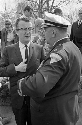 Keywords: blackandwhite monochrome outdoor black and white On June 26, 1963, the North Carolina General Assembly passed the Act to Regulate Visiting Speakers, later known as the Speaker Ban Law. The law forbade anyone to speak on a University of North Carolina campus who was a known member of the Communist Party, was known to advocate overthrow of the United States Constitution, or had invoked the Fifth Amendment in respect of communist or "subversive" connections. The law was rushed through in the closing hours of the legislative session with virtually no debate. Governor Terry Sanford was against the Speaker Ban bill, but at that time the governor of North Carolina could not veto legislation. In the wake of the passage of this law, the communities on the UNC campuses rose up in protest. Students, faculty, and community members protested the law and what it represented over the course of the next several years. A number of complex issues involving many key North Carolina political figures and national leaders kept the controversy very active and widely debated through the mid-1960's. In 1965, the North Carolina General Assembly established a commission to look into the consequenses of the law and recommend either ammedment or repeal of the law. The commission held public hearings in August and September of 1965 and in November amended the law absolving the state legislature from having to make rulings on who could speak on campuses and who could not and returning effective control over those issues to the universities. (Speaker Ban Law Study Commission records are held by the State Archives of North Carolina; finding aid is online www.archives.ncdcr.gov/findingaids/pdf/sa_speaker_ban_law...). In 1966 students at the University of North Carolina at Chapel Hill led by Student Body President Paul Dickson invited Herbert Aptheker and Frank Wilkinson ('known' Communists) to speak on the campus. As expected, the university refused to allow either of the speakers to give their speeches on campus. Instead, they addressed the assembled crowd on March 2, 1966, from across the stone wall that separates the university from the town of Chapel Hill. Ultimately a federal law suit against the university and the State of North Carolina was filed by UNC students. On February 19, 1968, after two years of consideration by the Federal District Court in Greensboro, Dickson, et al. v Sitterson, et al. was decided for the plaintiffs -- the court's opinion found the Speaker Ban law and policy unconstitutional. For more information on the Speaker Ban Law, its complexities, and surrounding events, please see this online exhibit and collection www.lib.unc.edu/mss/exhibits/protests/ban.html, NCpedia entry ncpedia.org/speaker-ban-law, and www.northcarolinahistory.org/commentary/187/entry/, used in the drafting of the above description of this set of images. COPYRIGHTED BY THE RALEIGH NEWS AND OBSERVER NEWSPAPER. DO NOT USE OR PUBLISH WITHOUT EXPRESSED CONSENT FROM THE N&O. On June 26, 1963, the North Carolina General Assembly passed the Act to Regulate Visiting Speakers, later known as the Speaker Ban Law. The law forbade anyone to speak on a University of North Carolina campus who was a known member of the Communist Party, was known to advocate overthrow of the United States Constitution, or had invoked the Fifth Amendment in respect of communist or "subversive" connections. The law was rushed through in the closing hours of the legislative session with virtually no debate. Governor Terry Sanford was against the Speaker Ban bill, but at that time the governor of North Carolina could not veto legislation. In the wake of the passage of this law, the communities on the UNC campuses rose up in protest. Students, faculty, and community members protested the law and what it represented over the course of the next several years. A number of complex issues involving many key North Carolina political figures and national leaders kept the controversy very active and widely debated through the mid-1960's. In 1965, the North Carolina General Assembly established a commission to look into the consequenses of the law and recommend either ammedment or repeal of the law. The commission held public hearings in August and September of 1965 and in November amended the law absolving the state legislature from having to make rulings on who could speak on campuses and who could not and returning effective control over those issues to the universities. (Speaker Ban Law Study Commission records are held by the State Archives of North Carolina; finding aid is online www.archives.ncdcr.gov/findingaids/pdf/sa_speaker_ban_law...). In 1966 students at the University of North Carolina at Chapel Hill led by Student Body President Paul Dickson invited Herbert Aptheker and Frank Wilkinson ('known' Communists) to speak on the campus. As expected, the university refused to allow either of the speakers to give their speeches on campus. Instead, they addressed the assembled crowd on March 2, 1966, from across the stone wall that separates the university from the town of Chapel Hill. Ultimately a federal law suit against the university and the State of North Carolina was filed by UNC students. On February 19, 1968, after two years of consideration by the Federal District Court in Greensboro, Dickson, et al. v Sitterson, et al. was decided for the plaintiffs -- the court's opinion found the Speaker Ban law and policy unconstitutional. For more information on the Speaker Ban Law, its complexities, and surrounding events, please see this online exhibit and collection www.lib.unc.edu/mss/exhibits/protests/ban.html, NCpedia entry ncpedia.org/speaker-ban-law, and www.northcarolinahistory.org/commentary/187/entry/, used in the drafting of the above description of this set of images. COPYRIGHTED BY THE RALEIGH NEWS AND OBSERVER NEWSPAPER. DO NOT USE OR PUBLISH WITHOUT EXPRESSED CONSENT FROM THE N&O.