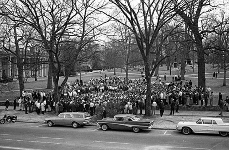 Keywords: blackandwhite monochrome outdoor tree plant black and white On June 26, 1963, the North Carolina General Assembly passed the Act to Regulate Visiting Speakers, later known as the Speaker Ban Law. The law forbade anyone to speak on a University of North Carolina campus who was a known member of the Communist Party, was known to advocate overthrow of the United States Constitution, or had invoked the Fifth Amendment in respect of communist or "subversive" connections. The law was rushed through in the closing hours of the legislative session with virtually no debate. Governor Terry Sanford was against the Speaker Ban bill, but at that time the governor of North Carolina could not veto legislation. In the wake of the passage of this law, the communities on the UNC campuses rose up in protest. Students, faculty, and community members protested the law and what it represented over the course of the next several years. A number of complex issues involving many key North Carolina political figures and national leaders kept the controversy very active and widely debated through the mid-1960's. In 1965, the North Carolina General Assembly established a commission to look into the consequenses of the law and recommend either ammedment or repeal of the law. The commission held public hearings in August and September of 1965 and in November amended the law absolving the state legislature from having to make rulings on who could speak on campuses and who could not and returning effective control over those issues to the universities. (Speaker Ban Law Study Commission records are held by the State Archives of North Carolina; finding aid is online www.archives.ncdcr.gov/findingaids/pdf/sa_speaker_ban_law...). In 1966 students at the University of North Carolina at Chapel Hill led by Student Body President Paul Dickson invited Herbert Aptheker and Frank Wilkinson ('known' Communists) to speak on the campus. As expected, the university refused to allow either of the speakers to give their speeches on campus. Instead, they addressed the assembled crowd on March 2, 1966, from across the stone wall that separates the university from the town of Chapel Hill. Ultimately a federal law suit against the university and the State of North Carolina was filed by UNC students. On February 19, 1968, after two years of consideration by the Federal District Court in Greensboro, Dickson, et al. v Sitterson, et al. was decided for the plaintiffs -- the court's opinion found the Speaker Ban law and policy unconstitutional. For more information on the Speaker Ban Law, its complexities, and surrounding events, please see this online exhibit and collection www.lib.unc.edu/mss/exhibits/protests/ban.html, NCpedia entry ncpedia.org/speaker-ban-law, and www.northcarolinahistory.org/commentary/187/entry/, used in the drafting of the above description of this set of images. COPYRIGHTED BY THE RALEIGH NEWS AND OBSERVER NEWSPAPER. DO NOT USE OR PUBLISH WITHOUT EXPRESSED CONSENT FROM THE N&O. On June 26, 1963, the North Carolina General Assembly passed the Act to Regulate Visiting Speakers, later known as the Speaker Ban Law. The law forbade anyone to speak on a University of North Carolina campus who was a known member of the Communist Party, was known to advocate overthrow of the United States Constitution, or had invoked the Fifth Amendment in respect of communist or "subversive" connections. The law was rushed through in the closing hours of the legislative session with virtually no debate. Governor Terry Sanford was against the Speaker Ban bill, but at that time the governor of North Carolina could not veto legislation. In the wake of the passage of this law, the communities on the UNC campuses rose up in protest. Students, faculty, and community members protested the law and what it represented over the course of the next several years. A number of complex issues involving many key North Carolina political figures and national leaders kept the controversy very active and widely debated through the mid-1960's. In 1965, the North Carolina General Assembly established a commission to look into the consequenses of the law and recommend either ammedment or repeal of the law. The commission held public hearings in August and September of 1965 and in November amended the law absolving the state legislature from having to make rulings on who could speak on campuses and who could not and returning effective control over those issues to the universities. (Speaker Ban Law Study Commission records are held by the State Archives of North Carolina; finding aid is online www.archives.ncdcr.gov/findingaids/pdf/sa_speaker_ban_law...). In 1966 students at the University of North Carolina at Chapel Hill led by Student Body President Paul Dickson invited Herbert Aptheker and Frank Wilkinson ('known' Communists) to speak on the campus. As expected, the university refused to allow either of the speakers to give their speeches on campus. Instead, they addressed the assembled crowd on March 2, 1966, from across the stone wall that separates the university from the town of Chapel Hill. Ultimately a federal law suit against the university and the State of North Carolina was filed by UNC students. On February 19, 1968, after two years of consideration by the Federal District Court in Greensboro, Dickson, et al. v Sitterson, et al. was decided for the plaintiffs -- the court's opinion found the Speaker Ban law and policy unconstitutional. For more information on the Speaker Ban Law, its complexities, and surrounding events, please see this online exhibit and collection www.lib.unc.edu/mss/exhibits/protests/ban.html, NCpedia entry ncpedia.org/speaker-ban-law, and www.northcarolinahistory.org/commentary/187/entry/, used in the drafting of the above description of this set of images. COPYRIGHTED BY THE RALEIGH NEWS AND OBSERVER NEWSPAPER. DO NOT USE OR PUBLISH WITHOUT EXPRESSED CONSENT FROM THE N&O. |