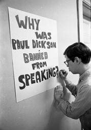 | Keywords: blackandwhite monochrome text black and white On June 26, 1963, the North Carolina General Assembly passed the Act to Regulate Visiting Speakers, later known as the Speaker Ban Law. The law forbade anyone to speak on a University of North Carolina campus who was a known member of the Communist Party, was known to advocate overthrow of the United States Constitution, or had invoked the Fifth Amendment in respect of communist or "subversive" connections. The law was rushed through in the closing hours of the legislative session with virtually no debate. Governor Terry Sanford was against the Speaker Ban bill, but at that time the governor of North Carolina could not veto legislation. In the wake of the passage of this law, the communities on the UNC campuses rose up in protest. Students, faculty, and community members protested the law and what it represented over the course of the next several years. A number of complex issues involving many key North Carolina political figures and national leaders kept the controversy very active and widely debated through the mid-1960's. In 1965, the North Carolina General Assembly established a commission to look into the consequenses of the law and recommend either ammedment or repeal of the law. The commission held public hearings in August and September of 1965 and in November amended the law absolving the state legislature from having to make rulings on who could speak on campuses and who could not and returning effective control over those issues to the universities. (Speaker Ban Law Study Commission records are held by the State Archives of North Carolina; finding aid is online www.archives.ncdcr.gov/findingaids/pdf/sa_speaker_ban_law...). In 1966 students at the University of North Carolina at Chapel Hill led by Student Body President Paul Dickson invited Herbert Aptheker and Frank Wilkinson ('known' Communists) to speak on the campus. As expected, the university refused to allow either of the speakers to give their speeches on campus. Instead, they addressed the assembled crowd on March 2, 1966, from across the stone wall that separates the university from the town of Chapel Hill. Ultimately a federal law suit against the university and the State of North Carolina was filed by UNC students. On February 19, 1968, after two years of consideration by the Federal District Court in Greensboro, Dickson, et al. v Sitterson, et al. was decided for the plaintiffs -- the court's opinion found the Speaker Ban law and policy unconstitutional. For more information on the Speaker Ban Law, its complexities, and surrounding events, please see this online exhibit and collection www.lib.unc.edu/mss/exhibits/protests/ban.html, NCpedia entry ncpedia.org/speaker-ban-law, and www.northcarolinahistory.org/commentary/187/entry/, used in the drafting of the above description of this set of images. COPYRIGHTED BY THE RALEIGH NEWS AND OBSERVER NEWSPAPER. DO NOT USE OR PUBLISH WITHOUT EXPRESSED CONSENT FROM THE N&O. On June 26, 1963, the North Carolina General Assembly passed the Act to Regulate Visiting Speakers, later known as the Speaker Ban Law. The law forbade anyone to speak on a University of North Carolina campus who was a known member of the Communist Party, was known to advocate overthrow of the United States Constitution, or had invoked the Fifth Amendment in respect of communist or "subversive" connections. The law was rushed through in the closing hours of the legislative session with virtually no debate. Governor Terry Sanford was against the Speaker Ban bill, but at that time the governor of North Carolina could not veto legislation. In the wake of the passage of this law, the communities on the UNC campuses rose up in protest. Students, faculty, and community members protested the law and what it represented over the course of the next several years. A number of complex issues involving many key North Carolina political figures and national leaders kept the controversy very active and widely debated through the mid-1960's. In 1965, the North Carolina General Assembly established a commission to look into the consequenses of the law and recommend either ammedment or repeal of the law. The commission held public hearings in August and September of 1965 and in November amended the law absolving the state legislature from having to make rulings on who could speak on campuses and who could not and returning effective control over those issues to the universities. (Speaker Ban Law Study Commission records are held by the State Archives of North Carolina; finding aid is online www.archives.ncdcr.gov/findingaids/pdf/sa_speaker_ban_law...). In 1966 students at the University of North Carolina at Chapel Hill led by Student Body President Paul Dickson invited Herbert Aptheker and Frank Wilkinson ('known' Communists) to speak on the campus. As expected, the university refused to allow either of the speakers to give their speeches on campus. Instead, they addressed the assembled crowd on March 2, 1966, from across the stone wall that separates the university from the town of Chapel Hill. Ultimately a federal law suit against the university and the State of North Carolina was filed by UNC students. On February 19, 1968, after two years of consideration by the Federal District Court in Greensboro, Dickson, et al. v Sitterson, et al. was decided for the plaintiffs -- the court's opinion found the Speaker Ban law and policy unconstitutional. For more information on the Speaker Ban Law, its complexities, and surrounding events, please see this online exhibit and collection www.lib.unc.edu/mss/exhibits/protests/ban.html, NCpedia entry ncpedia.org/speaker-ban-law, and www.northcarolinahistory.org/commentary/187/entry/, used in the drafting of the above description of this set of images. COPYRIGHTED BY THE RALEIGH NEWS AND OBSERVER NEWSPAPER. DO NOT USE OR PUBLISH WITHOUT EXPRESSED CONSENT FROM THE N&O. |