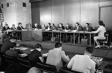 | Keywords: blackandwhite monochrome room indoor black and white Inside the North Carolina State Legislative Building, August 1965. On June 26, 1963, the North Carolina General Assembly passed the Act to Regulate Visiting Speakers, later known as the Speaker Ban Law. The law forbade anyone to speak on a University of North Carolina campus who was a known member of the Communist Party, was known to advocate overthrow of the United States Constitution, or had invoked the Fifth Amendment in respect of communist or "subversive" connections. The law was rushed through in the closing hours of the legislative session with virtually no debate. Governor Terry Sanford was against the Speaker Ban bill, but at that time the governor of North Carolina could not veto legislation. In the wake of the passage of this law, the communities on the UNC campuses rose up in protest. Students, faculty, and community members protested the law and what it represented over the course of the next several years. A number of complex issues involving many key North Carolina political figures and national leaders kept the controversy very active and widely debated through the mid-1960's. In 1965, the North Carolina General Assembly established a commission to look into the consequenses of the law and recommend either ammedment or repeal of the law. The commission held public hearings in August and September of 1965 and in November amended the law absolving the state legislature from having to make rulings on who could speak on campuses and who could not and returning effective control over those issues to the universities. (Speaker Ban Law Study Commission records are held by the State Archives of North Carolina; finding aid is online www.archives.ncdcr.gov/findingaids/pdf/sa_speaker_ban_law...). In 1966 students at the University of North Carolina at Chapel Hill led by Student Body President Paul Dickson invited Herbert Aptheker and Frank Wilkinson ('known' Communists) to speak on the campus. As expected, the university refused to allow either of the speakers to give their speeches on campus. Instead, they addressed the assembled crowd on March 2, 1966, from across the stone wall that separates the university from the town of Chapel Hill. Ultimately a federal law suit against the university and the State of North Carolina was filed by UNC students. On February 19, 1968, after two years of consideration by the Federal District Court in Greensboro, Dickson, et al. v Sitterson, et al. was decided for the plaintiffs -- the court's opinion found the Speaker Ban law and policy unconstitutional. For more information on the Speaker Ban Law, its complexities, and surrounding events, please see this online exhibit and collection www.lib.unc.edu/mss/exhibits/protests/ban.html, NCpedia entry ncpedia.org/speaker-ban-law, and www.northcarolinahistory.org/commentary/187/entry/, used in the drafting of the above description of this set of images. COPYRIGHTED BY THE RALEIGH NEWS AND OBSERVER NEWSPAPER. DO NOT USE OR PUBLISH WITHOUT EXPRESSED CONSENT FROM THE N&O. Inside the North Carolina State Legislative Building, August 1965. On June 26, 1963, the North Carolina General Assembly passed the Act to Regulate Visiting Speakers, later known as the Speaker Ban Law. The law forbade anyone to speak on a University of North Carolina campus who was a known member of the Communist Party, was known to advocate overthrow of the United States Constitution, or had invoked the Fifth Amendment in respect of communist or "subversive" connections. The law was rushed through in the closing hours of the legislative session with virtually no debate. Governor Terry Sanford was against the Speaker Ban bill, but at that time the governor of North Carolina could not veto legislation. In the wake of the passage of this law, the communities on the UNC campuses rose up in protest. Students, faculty, and community members protested the law and what it represented over the course of the next several years. A number of complex issues involving many key North Carolina political figures and national leaders kept the controversy very active and widely debated through the mid-1960's. In 1965, the North Carolina General Assembly established a commission to look into the consequenses of the law and recommend either ammedment or repeal of the law. The commission held public hearings in August and September of 1965 and in November amended the law absolving the state legislature from having to make rulings on who could speak on campuses and who could not and returning effective control over those issues to the universities. (Speaker Ban Law Study Commission records are held by the State Archives of North Carolina; finding aid is online www.archives.ncdcr.gov/findingaids/pdf/sa_speaker_ban_law...). In 1966 students at the University of North Carolina at Chapel Hill led by Student Body President Paul Dickson invited Herbert Aptheker and Frank Wilkinson ('known' Communists) to speak on the campus. As expected, the university refused to allow either of the speakers to give their speeches on campus. Instead, they addressed the assembled crowd on March 2, 1966, from across the stone wall that separates the university from the town of Chapel Hill. Ultimately a federal law suit against the university and the State of North Carolina was filed by UNC students. On February 19, 1968, after two years of consideration by the Federal District Court in Greensboro, Dickson, et al. v Sitterson, et al. was decided for the plaintiffs -- the court's opinion found the Speaker Ban law and policy unconstitutional. For more information on the Speaker Ban Law, its complexities, and surrounding events, please see this online exhibit and collection www.lib.unc.edu/mss/exhibits/protests/ban.html, NCpedia entry ncpedia.org/speaker-ban-law, and www.northcarolinahistory.org/commentary/187/entry/, used in the drafting of the above description of this set of images. COPYRIGHTED BY THE RALEIGH NEWS AND OBS