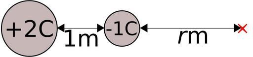 Keywords: No electric field.svg en Diagram showing the point at which there is no electric field in a system consisting of a +2C and a -1C charge 1m apart with a distance r labelled own Sjlegg 2009-04-16 Field diagrams