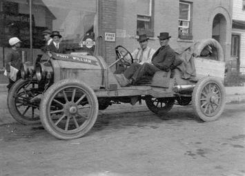 | Keywords: thunder bay thunderbay port arthur portarthur fort william fortwilliam duluth cars automobiles driving road trip roadtrip transportation ontario canada history cadillac central garage centralgarage blackandwhite monochrome wheel vehicle bike black and white Date: 21 August 1915 Description: In 1915 there wasn't any road between Thunder Bay and Duluth. That didn't stop W.H. Foote, R. Blanchard, and Bert Skeels (accompanied by their plucky dog) from making the trip. This photograph shows the intrepid team in front of Central Garage on Park Street at the beginning of their journey. For five days, the men traveled over land, through heavy bush, and across streams and creeks to reach their destination. In addition to their provisions, these men carried with them several spare tires, shovels, pick axes, and other useful tools to help them along their journey. The hood of their 1911 Cadillac sported two pennants - one with "Fort William" written on it, the other "Port Arthur". Accession No.: 972.16.3 Date: 21 August 1915 Description: In 1915 there wasn't any road between Thunder Bay and Duluth. That didn't stop W.H. Foote, R. Blanchard, and Bert Skeels (accompanied by their plucky dog) from making the trip. This photograph shows the intrepid team in front of Central Garage on Park Street at the beginning of their journey. For five days, the men traveled over land, through heavy bush, and across streams and creeks to reach their destination. In addition to their provisions, these men carried with them several spare tires, shovels, pick axes, and other useful tools to help them along their journey. The hood of their 1911 Cadillac sported two pennants - one with "Fort William" written on it, the other "Port Arthur". Accession No.: 972.16.3 |