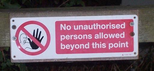 Keywords: No unauthorised.jpg A sign warning that no aunotherised people are allowed Photo taken by Norman Rogers on September 1 2004 English language signs No trespassing signs Red circle with left slash Warning signs in the United States