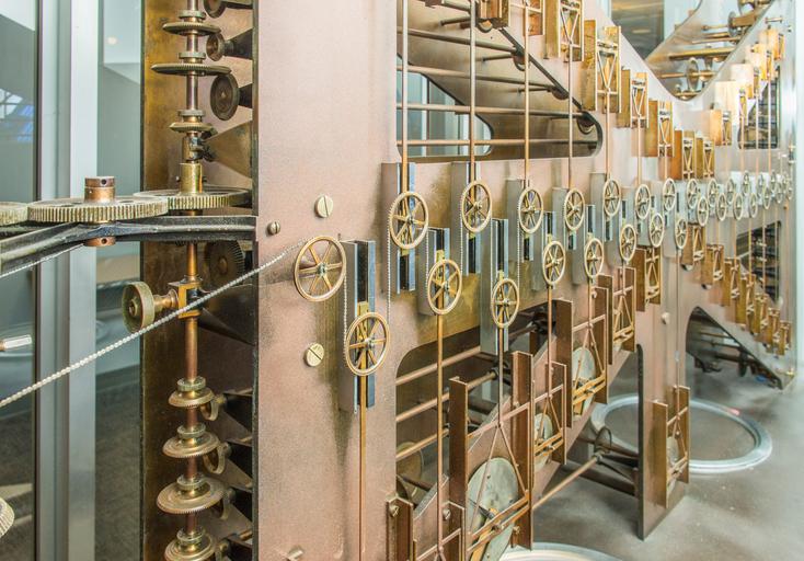 Keywords: NOAA's Tide Predicting Machine No. 2.jpg en This photo shows the largest of the three sections of Tide Predicting Machine No 2 a special purpose mechanical analog computer for predicting the height and time of high and low tides The gears on the left transmit power from the hand crank The components on the right contribute to the computation of the time of high and low tides The U S government used Tide Predicting Machine No 2 from 1910 to 1965 to predict tides for ports around the world The machine also known as Old Brass Brains uses an intricate arrangement of gears pulleys chains slides and other mechanical components to perform the computations A person using the machine would require 2-3 days to compute a year ™s tides at one location A person performing the same calculations by hand would require hundreds of days to perform the work The machine is 10 8 feet 3 3 m long 6 2 feet 1 9 m high and 2 0 feet 0 61 m wide and weighs approximately 2 500 pounds 1134 kg The operator powers the machine with a hand crank The National Oceanographic and Atmospheric Administration NOAA maintains the machine in working order 2016-03-14 11 19 54 own Steven Fine other versions 38 991561666667 -77 029463333333 cc-zero Machines Analog computers National Oceanic and Atmospheric Administration Silver Spring Maryland Tides Harmonic analysis Maritime navigation Mechanical calculators Tide-predicting machines navigation |