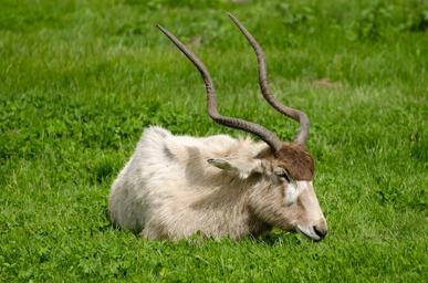 Keywords: nobody mammal green day head grass antelope outside one outdoors horns daytime side animal addax wildlife zoo