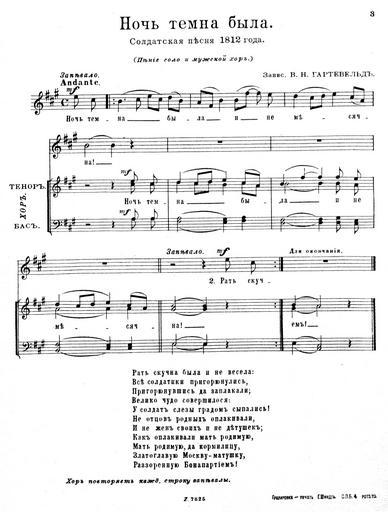 | Keywords: Noch Temna byla.jpg ru Песню « очь темна была» сочинили усские солдаты стоявшие под Та утином во главе с фельдма шалом И Кутузовым Здесь слышен и плач по одной «златоглавой оскве-матушке азо енной Бонапа тiем» и клятва отомстить чтобы «ни одна б душа инове ная не п ишла назад в свою сто ону » » Га тевельд В очь темна была солдатская песня 1812 года пение соло и мужской хо / зап В Га тевельд Санкт-Пете бу г и д Юлий Ген их Цимме ман б г 3 с 2015-02-19 http //www 1812 rsl ru/materials/notes/186/ timezone_id 126 Russian Folk Song arranged by Wilhelm Garteweld 1859 1927 other versions PD-old-70-1923 Uploaded with UploadWizard Russian folk songs Wilhelm Harteveld |