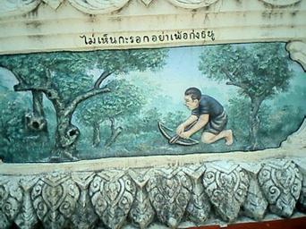| Keywords: Nock arrow.JPG Illustrated Proverb Don't nock your arrow before you see your squirrel Phra That Phanom chedi Amphoe That Phanom Nakhon Phanom Province northeastern Thailand 2004-06-21 Pawyi Lee Public domain Reliefs in Thailand Proverbs in art Thai proverbs |