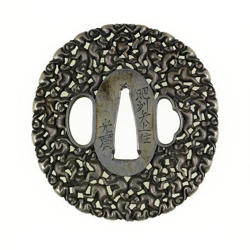 Keywords: Noda Mitsuhiro II - Tsuba with One Hundred Monkeys - Walters 51133.jpg One hundred monkeys was a typical motif for Mitsuhiro and other members of his school A multitude of monkeys are carved into the body of the tsuba Their eyes are highlighted in gold Hidden throughout the design are monkeys with special characteristics In the upper portion are the three monkeys who see no evil hear no evil and speak no evil At the lower right two monkeys are neck-wrestling with a rope tied around their necks In the upper left section a monkey holds a giant peach At the lower left a monkey has a bag over its shoulder In the upper right is a monkey carrying fan or a baton This tsuba is similar to another in the Walters collection by the same artist made of copper 51 112 Other known examples by Mitsuhiro are almost all in the same style with a single motif carved throughout the tsuba between 1770 1823 Edo silver cm 7 25 6 88 0 52 accession number 51 133 21366 Henry Walters Baltimore date and mode of acquisition unknown Walters Art Museum Henry Walters Acquired by Henry Walters hishu yagami ju/mitsuhiro; Translation Living at Yagami in Hizen province/Mitsuhiro place of origin Edo present-day Tokyo Japan Walters Art Museum license Tsuba in the Walters Art Museum Noda Mitsuhiro II Media contributed by the Walters Art Museum needs category review Reliefs of monkeys on Japanese sword fittings |