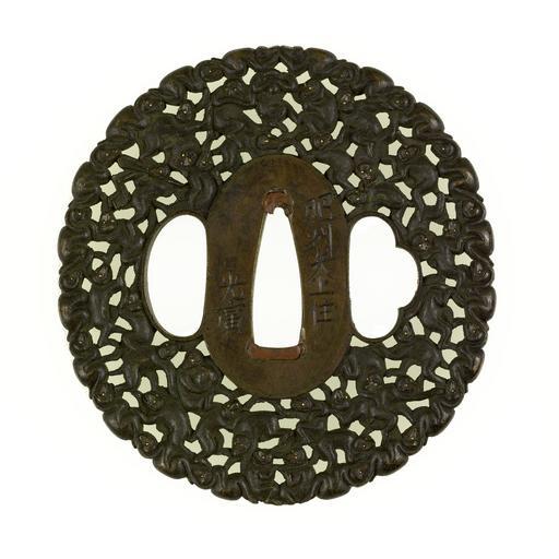 Keywords: Noda Mitsuhiro II - Tsuba with One Hundred Monkeys - Walters 51112.jpg One hundred monkeys was a typical motif for Mitsuhiro and other members of his school A multitude of monkeys are carved into the body of the tsuba Their eyes are highlighted in gold Hidden throughout the design are monkeys with special characteristics In the upper portion are the three monkeys who see no evil hear no evil and speak no evil At the bottom two monkeys are neck-wrestling with a rope tied around their necks In the upper left section is a monkey carrying fan or a baton Below a monkey holds a giant peach At the lower right a monkey has a bag over its shoulder This tsuba is similar to another in the Walters collection by the same artist made of silver 51 133 Other known examples by Mitsuhiro are almost all in the same style with a single motif carved throughout the tsuba between 1748 1823 late Edo sentoku gold copper cm 7 28 6 92 0 47 accession number 51 112 14744 Henry Walters Baltimore date and mode of acquisition unknown Walters Art Museum Henry Walters Acquired by Henry Walters Transcription Hishu Yagami ju/Mitsuhiro; Translation Living at Yagami in Hizen province/Mitsuhiro; Transcription Sentoku kin i saku kore; Translation This was made with sentoku and gold place of origin Edo present-day Tokyo Japan Walters Art Museum license Tsuba in the Walters Art Museum Noda Mitsuhiro II Media contributed by the Walters Art Museum needs category review Reliefs of monkeys on Japanese sword fittings |