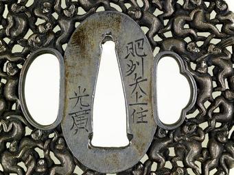 | Keywords: Noda Mitsuhiro II - Tsuba with One Hundred Monkeys - Walters 51133 - Mark.jpg One hundred monkeys was a typical motif for Mitsuhiro and other members of his school A multitude of monkeys are carved into the body of the tsuba Their eyes are highlighted in gold Hidden throughout the design are monkeys with special characteristics In the upper portion are the three monkeys who see no evil hear no evil and speak no evil At the lower right two monkeys are neck-wrestling with a rope tied around their necks In the upper left section a monkey holds a giant peach At the lower left a monkey has a bag over its shoulder In the upper right is a monkey carrying fan or a baton This tsuba is similar to another in the Walters collection by the same artist made of copper 51 112 Other known examples by Mitsuhiro are almost all in the same style with a single motif carved throughout the tsuba between 1770 1823 Edo silver cm 7 25 6 88 0 52 accession number 51 133 21366 Henry Walters Baltimore date and mode of acquisition unknown Walters Art Museum Henry Walters Acquired by Henry Walters hishu yagami ju/mitsuhiro; Translation Living at Yagami in Hizen province/Mitsuhiro place of origin Edo present-day Tokyo Japan Walters Art Museum license Tsuba in the Walters Art Museum Noda Mitsuhiro II Media contributed by the Walters Art Museum needs category review Reliefs of monkeys on Japanese sword fittings |