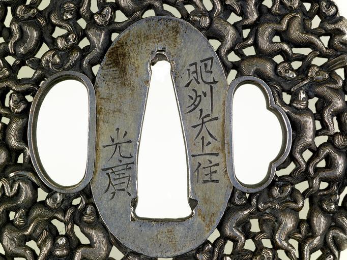 Keywords: Noda Mitsuhiro II - Tsuba with One Hundred Monkeys - Walters 51133 - Mark.jpg One hundred monkeys was a typical motif for Mitsuhiro and other members of his school A multitude of monkeys are carved into the body of the tsuba Their eyes are highlighted in gold Hidden throughout the design are monkeys with special characteristics In the upper portion are the three monkeys who see no evil hear no evil and speak no evil At the lower right two monkeys are neck-wrestling with a rope tied around their necks In the upper left section a monkey holds a giant peach At the lower left a monkey has a bag over its shoulder In the upper right is a monkey carrying fan or a baton This tsuba is similar to another in the Walters collection by the same artist made of copper 51 112 Other known examples by Mitsuhiro are almost all in the same style with a single motif carved throughout the tsuba between 1770 1823 Edo silver cm 7 25 6 88 0 52 accession number 51 133 21366 Henry Walters Baltimore date and mode of acquisition unknown Walters Art Museum Henry Walters Acquired by Henry Walters hishu yagami ju/mitsuhiro; Translation Living at Yagami in Hizen province/Mitsuhiro place of origin Edo present-day Tokyo Japan Walters Art Museum license Tsuba in the Walters Art Museum Noda Mitsuhiro II Media contributed by the Walters Art Museum needs category review Reliefs of monkeys on Japanese sword fittings |