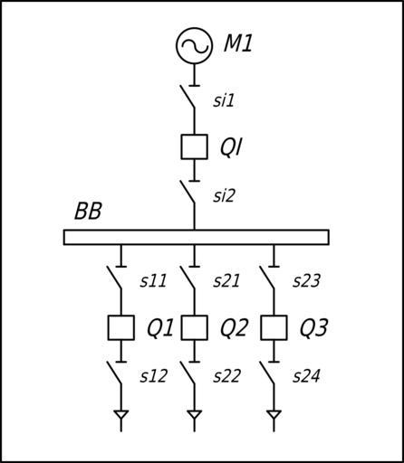 Π΅ΠΌΠ° M1 - ΠΈΡΡΠΎΡΠ½ΠΈΠΊ ΠΏΠΈΡΠ°Π½ΠΈΡ QI - Π²Π²ΠΎΠ΄Π½ΠΎΠΉ Π²ΡΠΊΠ»ΡΡΠ°ΡΠ΅Π»Ρ<br> si1 si2 - Ρ Π°Π·ΡΠ΅Π΄ΠΈΠ½ΠΈΡΠ΅Π»ΠΈ Π²Π²ΠΎΠ΄Π½ΠΎΠ³ΠΎ Π²ΡΠΊΠ»ΡΡΠ°ΡΠ΅Π»Ρ BB - ΡΠ±ΠΎΡ Π½ΡΠ΅ ΡΠΈΠ½Ρ Q1 Q2 Q3 - ΡΠΈΠ»ΠΎΠ²ΡΠ΅ Π²ΡΠΊΠ»ΡΡΠ°ΡΠ΅Π»ΠΈ ΠΎΡΡ