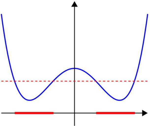 Keywords: Nonquasiconvex function.png Made by myself with MATLAB graph Source code <pre> function main prepare the scrreen and define some parameters clf; hold on; axis equal; axis off; fontsize 25; thick_line 3; thin_line 2; black 0 0 0; red 1 0 0; arrowsize 0 1; arrow_type 1; arrow_angle 30; angle in degrees L 1 15; X -L 0 01 L ; f inline '2 X 4-X 2+1 -1 3' ; Y f X ; plot X Y 'linewidth' thick_line arrow X 1 0 X length X 0 thin_line arrowsize arrow_angle arrow_type black arrow 0 min Y -0 4 0 max Y +0 2 thin_line arrowsize arrow_angle arrow_type black a 0 5; Z X 0+a; plot X Z 'linewidth' thin_line 'linestyle' '--' 'color' 'r' ; x0 -10; for i 2 length X -1 x X i ; xp X i-1 ; if x < 0 f x < a f xp > a x0 x; elseif x < 0 f x > a f xp < a x1 x; elseif x > 0 f x < a f xp > a x2 x; elseif x > 0 f x > a f xp < a x3 x; end end plot x0 x1 0 0 'linewidth' 2 thick_line 'color' 'r' ; plot x2 x3 0 0 'linewidth' 2 thick_line 'color' 'r' ; saveas gcf 'Nonquasiconvex_function eps' 'psc2' export to eps function arrow start stop thickness arrow_size sharpness arrow_type color Function arguments start stop start and end coordinates of arrow vectors of size 2 thickness thickness of arrow stick arrow_size the size of the two sides of the angle in this picture -> sharpness angle between the arrow stick and arrow side in degrees arrow_type 1 for filled arrow otherwise the arrow will be just two segments color arrow color a vector of length three with values in 0 1 convert to complex numbers i sqrt -1 ; start start 1 +i start 2 ; stop stop 1 +i stop 2 ; rotate_angle exp i pi sharpness/180 ; points making up the arrow tip besides the stop point point1 stop - arrow_size rotate_angle stop-start /abs stop-start ; point2 stop - arrow_size/rotate_angle stop-start /abs stop-start ; if arrow_type 1 filled arrow plot the stick but not till the end looks bad t 0 5 arrow_size cos pi sharpness/180 /abs stop-start ; stop1 t start+ 1-t stop; plot real start stop1 imag start stop1 'LineWidth' thickness 'Color' color ; fill the arrow H fill real stop point1 point2 imag stop point1 point2 color ; set H 'EdgeColor' 'none' else two-segment arrow plot real start stop imag start stop 'LineWidth' thickness 'Color' color ; plot real stop point1 imag stop point1 'LineWidth' thickness 'Color' color ; plot real stop point2 imag stop point2 'LineWidth' thickness 'Color' color ; end </pre> convexity functions Files by User Oleg Alexandrov from en wikipedia math |