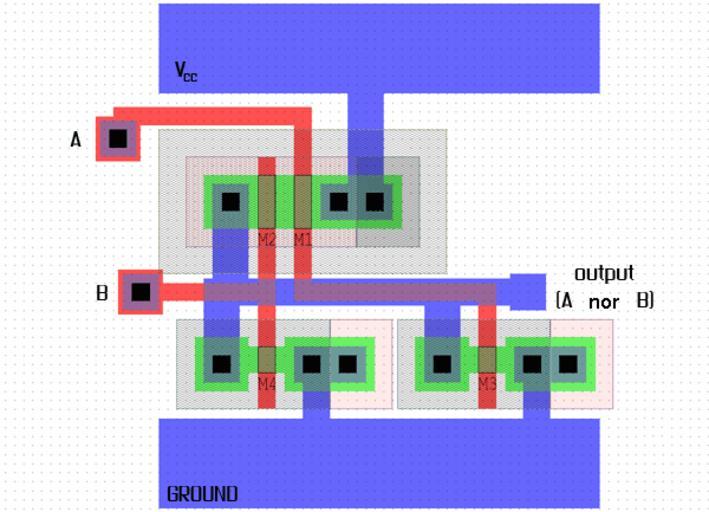 Keywords: NOR gate layout.png Shows a CMOS implementation of a NOR gate Also used at http //www sccs swarthmore edu/users/06/adem/engin/e77vlsi/lab3/ 2009-11-20 own assumed Miquel puig NOR gates