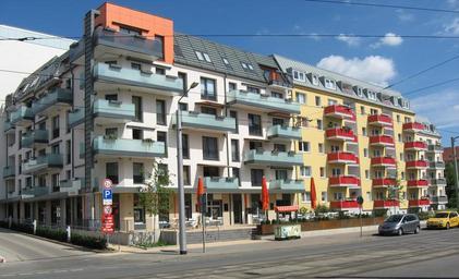 Keywords: nordhausen germany buildings colorful apartments architecture sky clouds vehicles street urban city cities summer spring