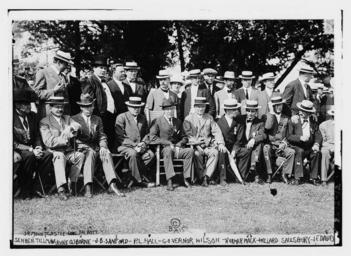 | Keywords: Norman6458.jpg Bain News Service publisher 1 Sen Ben Tillman 2 John E Osborne 3 J B Sanford 4 P L Hall 5 Governor Woodrow Wilson 6 Norman Mack 7 Willard Saulsbury 8 J E Davies 9 J R Mountcastle 10 Cong Talbott between ca 1910 and ca 1915 1 negative glass ; 5 x 7 in or smaller Notes Title from data provided by the Bain News Service on the negative Forms part of George Grantham Bain Collection Library of Congress Format Glass negatives Rights Info No known restrictions on publication Repository Library of Congress Prints and Photographs Division Washington D C 20540 USA http //hdl loc gov/loc pnp/pp print hdl loc gov/loc pnp/pp print General information about the Bain Collection is available at http //hdl loc gov/loc pnp/pp ggbain hdl loc gov/loc pnp/pp ggbain Persistent URL http //hdl loc gov/loc pnp/ggbain 13012 hdl loc gov/loc pnp/ggbain 13012 Call Number LC-B2- 2692-12 http //www flickr com/photos/library_of_congress/3379428162/ 1 Sen Ben Tillman 2 John E Osborne 3 J B Sanford 4 P L Hall 5 Governor Woodrow Wilson 6 Norman Mack 7 Willard Saulsbury 8 J E Davies 9 J R Mountcastle 10 Cong Talbott LOC LOC-image ggbain 13012 Uploaded by Gary Dee http //www flickr com/people/8623220 N02 The Library of Congress http //www loc gov/rr/print/195_copr html noknown The Library of Congress Flickr Commons PD-Bain File Upload Bot Magnus Manske December 14 2011 August 1912 Woodrow Wilson |