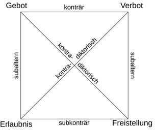 | Keywords: Normenquadrat.svg Das Normenquadrat stellt die Zusammenhänge der verschiedenen Typen an Rechtsnormen dar Siehe auch Logisches Quadrat Erläuterung Liegt ein Gebot vor kann kein Verbot vorliegen Liegt ein Verbot vor kann kein Gebot vorliegen Das Nichtvorliegen eines Gebotes lässt jedoch keine Rückschlüsse auf das Vorliegen oder Nichtvorliegen eines Verbotes zu Ebenso lässt das Nichtvorliegen eines Verbotes keine Rückschlüsse auf das Vorliegen oder Nichtvorliegen eines Gebotes zu konträrer Zusammenhang Liegt ein Gebot vor muss eine Erlaubnis vorliegen Umgekehrt lässt das Vorliegen einer Erlaubnis jedoch keine Rückschlüsse auf das Vorliegen oder Nichtvorliegen eines Gebotes zu Liegt keine Erlaubnis vor kann kein Gebot vorliegen Das Nichtvorliegen eines Gebotes lässt keine Rückschlüsse auf das Vorliegen oder Nichtvorliegen einer Erlaubnis zu subalterner Zusammenhang Liegt ein Verbot vor kann keine Erlaubnis vorliegen Liegt kein Verbot vor muss eine Erlaubnis vorliegen Liegt eine Erlaubnis vor kann kein Verbot vorliegen Liegt keine Erlaubnis vor muss ein Verbot vorliegen kontradiktorischer Zusammenhang Liegt ein Verbot vor muss eine Freistellung vorliegen Liegt keine Freistellung vor kann kein Verbot vorliegen Das Nichtvorliegen eines Verbotes lässt keine Rückschlüsse auf das Vorliegen oder Nichtvorliegen einer Freistellung zu Ebenso lässt das Vorliegen einer Freistellung keine Rückschlüsse auf das Vorliegen oder Nichtvorliegen eines Verbotes zu subalterner Zusammenhang Liegt ein Gebot vor kann keine Freistellung vorliegen Liegt kein Gebot vor muss eine Freistellung vorliegen Liegt eine Freistellung vor kann kein Gebot vorliegen Liegt keine Freistellung vor muss ein Gebot vorliegen kontradiktorischer Zusammenhang Liegt keine Erlaubnis vor muss eine Freistellung vorliegen Liegt keine Freistellung vor muss eine Erlaubnis vorliegen Das Vorliegen einer Erlaubnis lässt keine Rückschlüsse auf das Vorliegen oder Nichtvorliegen einer Freistellung zu Ebenso lässt das Vorliegen einer Freistellung keine Rückschlüsse auf das Vorliegen oder Nichtvorliegen einer Erlaubnis zu subkonträrer Zusammenhang own 2014-05-14 de Benutzer Marcel Rogge Square of opposition Law |
