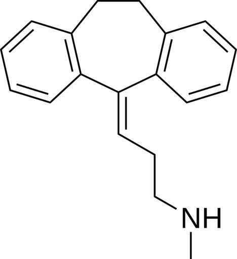 Keywords: Nortriptyline.svg en 2D structure of tricyclic antidepressant nortriptyline Sensoval own Harbin 2009-09-01 Tricyclic antidepressants Secondary amines Dibenzocycloheptenes