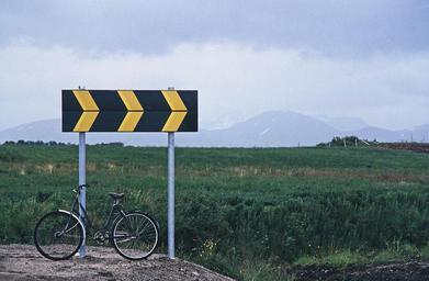 Keywords: norway curve bike traffic sign road sign shield road street sign arrow right yellow black mountains scan kb dia