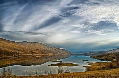 Keywords: norway lake water reflections mountains sky clouds nature outside country countryside shoreline scenic vista hdr
