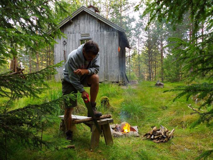 Keywords: norway nature log cabin man saw wood fire campfire forest