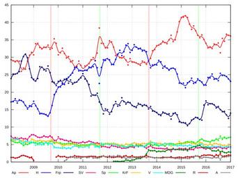 | Keywords: Norwegian Storting Monthly Party Polls.svg en What fraction of the population would vote for each party in a Norwegian Storting election based on monthly poll data from pollofpolls no starting from 2008 The vertical light red lines mark Storting elections while the light green ones mark local elections The x axis is the year and the y axis is the popularity in percent 2016-12-29 own Amaurea other versions Statistical charts Politics of Norway Stortinget Cc-zero | ||||