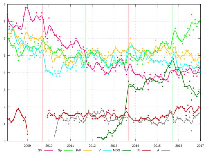 | Keywords: Norwegian Storting Monthly Party Polls, zoom.svg en What fraction of the population would vote for each party in a Norwegian Storting election based on monthly poll data from pollofpolls no starting from 2008 The vertical light red lines mark Storting elections while the light green ones mark local elections The x axis is the year and the y axis is the popularity in percent This is a zoom on the smaller parties - the three largest ones Ap H and Frp are all off the scale in this plot 2016-12-29 own Amaurea other versions cc-zero Statistical graphs Politics of Norway Stortinget |