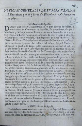 | Keywords: Noticiasgeneralesvenidasabarcelona.jpeg  es Ejemplar del 30 de septiembre de 1690 del periódico Noticias Generales Venidas a Barcelona Biblioteca Nacional de España Author 1690-09-30 El autor ha muerto hace más de 300 años 1690 in Catalonia PD-old-100 |
