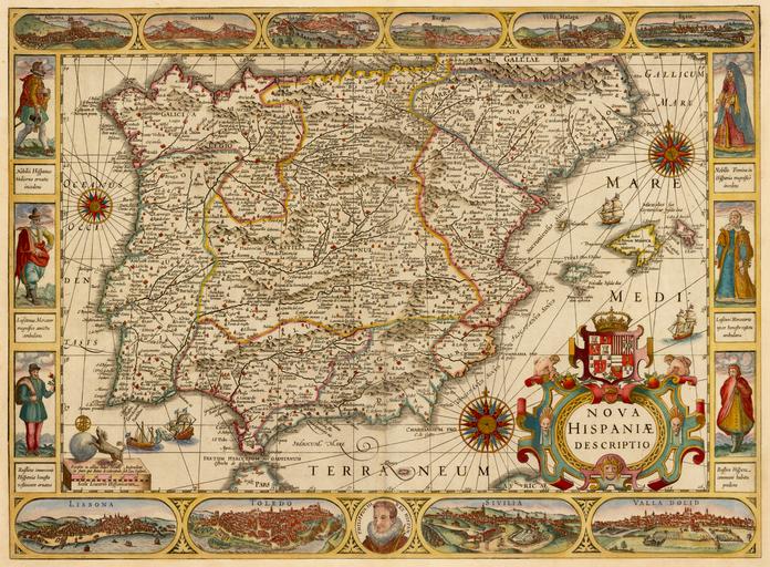Keywords: Nova Hispaniae Descriptio, por Jodocus Hondius.jpg Artwork es Orientado con rosas con lis Nudos de rumbos - Márgenes graduados Dibujados meridianos y paralelos formando cuadrícula - Relieve por montes de perfil y sombreado - Red hidrográfica destacada - Abundante toponimia - Divisiones administrativas diferenciadas por color - Poblaciones representadas por conjuntos de edificaciones según su importancia - Costas sombreadas con un fino rayado El mapa no está datado pero se puede fechar hacia 1610 teniendo en cuenta la presencia del retrato del rey Felipe III 1598 -1621 y el año del fallecimiento del autor 1612 En el ángulo inferior derecho cartela renacentista coronada por el escudo del reino de España incluyendo Portugal flanqueado por dos figuras masculinas sedentes y decoración de tres mascarones En el ángulo inferior izquierdo se encuentra la escala en un pedestal que en su parte superior tiene el emblema de establecimiento editorial En los laterales tres figuras femeninas y tres masculinas ataviadas con trajes de la época correspondientes a diferentes estamentos sociales En el margen inferior dentro de un medallón aparece el retrato del monarca Felipe III con la inscripción Philippus III Rex Hispan En el mar embarcaciones de la época En los márgenes superior e inferior incluye las vistas de la siguientes ciudades Alhama Granada Bilbao Burgos Veliz Malaga Eçija Lisbona Toledo Sivilia y Valladolid ~ 1610 Grabado en color cm 55 8 45 7 accession number object history credit line https //www raremaps com/gallery/detail/37574/Nova_Hispaniae_Descriptio/Hondius html Barry Lawrence Ruderman Antique Maps Inc PD-old-100 Maps by Jodocus Hondius Old maps of Spain |