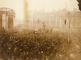 | Keywords: armistice day armisticeday wwi first world war firstworldwar celtic cross celticcross 16th irish division 16thirishdivision soldiers college green collegegreen dublin ireland bank of ireland bankofireland tcd crowds november 1924 1920s twenties commemoration w.d. hogan wdhogan hogan collection hogancollection national library of ireland nationallibraryofireland irish division irishdivision trinity college trinitycollege leinster tram cars wreaths tuesday 11th 20th century 20thcentury monochrome Photo taken in Dublin on Armistice Day, 89 years ago today. This huge crowd was gathered in College Green for the unveiling of a Celtic Cross in memory of the 16th Irish Division. The Irish Times estimated that 50,000 people were present at this ceremony. The Celtic Cross was temporarily erected in College Green for later transport to Guillemont, France, to stand as a permanent memorial to the dead of the 16th Irish Division. On Wednesday, 12 November 1924, the Irish Times reported: "There were hundreds of ex-service men, wearing their ribbons and medals, round the Celtic cross, in addition to those who took part in the official parades, and the display of Flanders poppies was not equalled by any city in the British Isles. It was a wonderful and heartening sight. After the Réveille had been sounded the National Anthem was sung publicly and lustily in the streets of Dublin for the first time for many years. ... It was stated last night that nearly 500,000 poppies had been sold in Dublin and district." Date: Tuesday, 11 November 1924 NLI Ref.: HOG131 Photo taken in Dublin on Armistice Day, 89 years ago today. This huge crowd was gathered in College Green for the unveiling of a Celtic Cross in memory of the 16th Irish Division. The Irish Times estimated that 50,000 people were present at this ceremony. The Celtic Cross was temporarily erected in College Green for later transport to Guillemont, France, to stand as a permanent memorial to the dead of the 16th Irish Division. On Wednesday, 12 November 1924, the Irish Times reported: "There were hundreds of ex-service men, wearing their ribbons and medals, round the Celtic cross, in addition to those who took part in the official parades, and the display of Flanders poppies was not equalled by any city in the British Isles. It was a wonderful and heartening sight. After the Réveille had been sounded the National Anthem was sung publicly and lustily in the streets of Dublin for the first time for many years. ... It was stated last night that nearly 500,000 poppies had been sold in Dublin and district." Date: Tuesday, 11 November 1924 NLI Ref.: HOG131 |