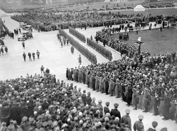 | Keywords: stormont opening of northern ireland parliament openingofnorthernirelandparliament northern ireland parliament northernirelandparliament prince of wales princeofwales crowds belfast antrim ireland northern ireland northernireland cars soldiers november 1932 1930s thirties royal visit royalvisit independent newspapers collection independentnewspaperscollection national library of ireland nationallibraryofireland blackandwhite monochrome outdoor people crowd black and white The scene at Stormont in Belfast, for the opening of the new Northern Ireland Parliament Buildings by the Prince of Wales. It was his first visit to Ireland. According to the next day's Irish Independent, the prince's route from Donegall Quay was crowded with cheering citizenry, and also "2,000 police, thousands of Orange stewards, and units of the Royal Navy." However, no Nationalist or Labour public representatives took part... It's interesting to see the sheer volume of cars - at least 54 are snaking up the road in the back and middle ground of this photo. Date: Wednesday, 16 November 1932 NLI Ref.: IND_H_2620 The scene at Stormont in Belfast, for the opening of the new Northern Ireland Parliament Buildings by the Prince of Wales. It was his first visit to Ireland. According to the next day's Irish Independent, the prince's route from Donegall Quay was crowded with cheering citizenry, and also "2,000 police, thousands of Orange stewards, and units of the Royal Navy." However, no Nationalist or Labour public representatives took part... It's interesting to see the sheer volume of cars - at least 54 are snaking up the road in the back and middle ground of this photo. Date: Wednesday, 16 November 1932 NLI Ref.: IND_H_2620 |