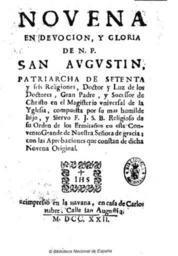 | Keywords: Novena en devocion 1722.jpg es Novena en devoción y gloria de N P San Augustin Texto impreso / compuesta por F J S B Religioso de su Orden de los Ermitaños - Reimpresso en la Havana en casa de Carlos Habre 1722 - 4 43 p ; 4º Signatura 2/1845 1722 http //bdh bne es/bnesearch/detalle/bdh0000107670 - Biblioteca Digital Hispánica Biblioteca Nacional de España F J S B Religioso de Su Orden de los Ermitaños other versions BNE PD-old-100 Uploaded with UploadWizard Spanish language | ||||