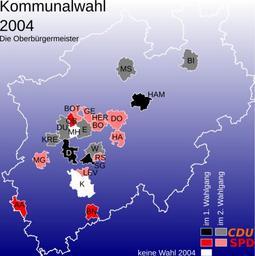 | Keywords: NRW election 2004 Oberbuergermeister.svg en Map of the outcome of the local elections 2004 in North Rhine-Westfalia showing the party of the elected oberbürgermeister Lord Mayor de Karte mit den Ergebnis der Kommunalwahlen 2004 in Nordrhein-Westfalen Gezeigt ist die Parteizugehörigkeit des gewählten Oberbürgermeisters own Vinom 2009-03-24 own work basiert auf 100px Local elections in North Rhine-Westphalia 2004 | ||||