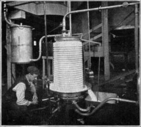 | Keywords: NSRW Dairy Industry 5.jpg <small>Copyright Brown Bros </small> FILTER AND PASTEURIZER The milk is next carried to a Pasteurizer First it passes through the filter which is the upper can on the left of the picture It then passes to the Pasteurizer which you see in the center of the picture It is first warmed by being allowed to run down over the outside of the Pasteurizer and it is then forced up through the interior which contains a steam coil where it is heated to 162° Fahr This kills the germs and makes it possible to keep the milk sweet for a week It is then carried through a pipe at the top of the Pasteurizer to the cooler Next >> Image LA2-NSRW-3-0230 jpg Pasteurization |