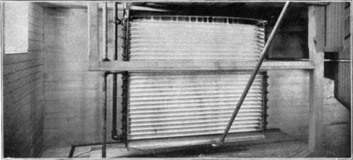 | Keywords: NSRW Dairy Industry 7.jpg <small>Copyright Brown Bros </small> From the Pasteurizer it is forced by a pump to the cooler where it is cooled from 162° Fahr to 42° Fahr This is done by letting the milk flow over the corrugated surface of this cooler which is filled with cold water The upper half of the cooler contains merely cold water while the lower-half is ice cold brine This prevents a too sudden change Next >> Image LA2-NSRW-3-0230 jpg | ||||