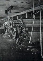 | Keywords: NSRW Story of Wool - carding machine.jpg en CARDING MACHINE Carding the wool formerly done by hand is now accomplished by machinery the carding machine consisting of a series of rollers which are covered with teeth The rollers are of different sizes set at different distances and revolving at different speeds The raw wool is fed into the machine at one end and by action of the rollers the fiber is combed and straightened and finally delivered in the form of a fluffy woolen rope which you see corning out of the front end of the machine The New Student's Reference Work v 5 1914 Story of Wool narrative between pp 2108 and 2109 second page Underwood Underwood published 1914 PD-US LA2-NSRW-5-0122 jpg Underwood Underwood Woollen mills |