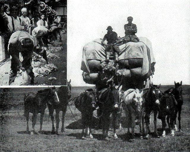 Keywords: NSRW Story of Wool - sheep shearing and taking wool to market.jpg en TAKING THE WOOL TO MARKET In the lower picture we have a scene from Argentina in South America where there are immense ranches devoted to the sheep industry The wool is clipped from the sheep in a single fleece This is rolled and a large number of the rolls packed together in a single bale These bales are carried by wagons to the nearest railroad point from whence the wool is carried to Buenos Ayres for shipment to other countries Upper left inset shows SHEEP SHEARING BY MACHINERY On the left side we have a picture of sheep shearing by machinery On the larger sheep ranches the method of shearing the sheep by power is being introduced The new method has several advantages over hand shearing; the process is much faster and therefore more economical; the fleece is taken off cleaner weighs more and is in better condition; and the shearing is more humane there being no nicking of the sheep The New Student's Reference Work v 5 1914 Story of Wool narrative between pp 2108 and 2109 first page Underwood Underwood published 1914 PD-US LA2-NSRW-5-0121 jpg Underwood Underwood Sheep shearing |