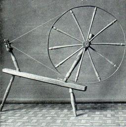| Keywords: NSRW Story of Wool - spinning wheel.jpg en SPINNING WHEEL This is the old spinning wheel once in use in nearly every farmhouse where they raised their own wool spun their own yarn and made their own cloth with a hand loom With the pin shown lying on the frame the spinner whirls the wheel with her right hand and with her left feeds onto the spindle the loose rolls of wool as they come from the cards The spindle revolves at a high rate of speed twisting the loose rolls into a hard yarn The New Student's Reference Work v 5 1914 Story of Wool narrative between pp 2108 and 2109 fourth page photograph from the Smithsonian Institution published 1914 PD-US LA2-NSRW-5-0124 jpg Spinning wheels Collections of the Smithsonian Institution |