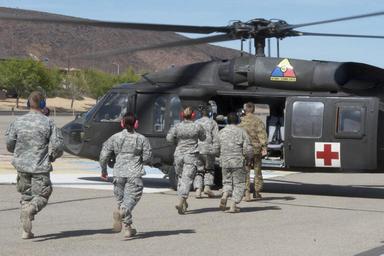 Keywords: weed army community hospital weedarmycommunityhospital wach national training center nationaltrainingcenter ntc fort irwin fortirwin california col. jason wieman coljasonwieman command sgt maj. albert harris commandsgtmajalbertharris 2916th aviation battalion 2916thaviationbattalion emergency medical care emergencymedicalcare meddac rhc-c rhcc patient care patientcare soldier readiness soldierreadiness army training armytraining medical evacuation medevac medicalevacuationmedevac outdoor FORT IRWIN, Calif. -- The 2916th Aviation Battalion utilized an off-cycle window in their calendar March 20 - 23 to conduct brigade-level training in the National Training Center's "Box". The exercise culminated at the Fort Irwin Weed Army Community Hospital (WACH) March 23. The goal of the training is to test readiness as well as hone emergency medical skills among the participating service members. One simulation presented the participants with an Improvised Explosive Device (IED) attack on a troop transport that resulted in 16 casualties. The role players required triage at the point of injury in the training area, then airlifted back to the WACH on Fort Irwin for treatment. This was a large-scale training module that involved complex planning. To make the exercise as authentic as possible training units had no warning of what they would encounter throughout the course of the event and participants were alerted only as the scenario unfolded, just as if the casualties and events were real. Large casualty events of this kind take a special type of planning coordination, material and geography to execute, and even more consideration to undertake, which makes the NTC an ideal venue for such training. The 2916th assumed the role of air medevac, requiring multiple airlifts to bring all casualties back to the WACH, where staff members prioritized, stabilized and treated the mock casualties, then prepared to fly any they determined needing specialized care beyond WACH capabilities to other nearby available medical facilities for more extensive treatment. To learn more about the people and facilities of the National Training Center and the Weed Army Community Hospital visit their official websites at www.irwin.army.mil or www.irwin.amedd.army.mil Photo by Michael Beaton, Public Affairs (Released). FORT IRWIN, Calif. -- The 2916th Aviation Battalion utilized an off-cycle window in their calendar March 20 - 23 to conduct brigade-level training in the National Training Center's "Box". The exercise culminated at the Fort Irwin Weed Army Community Hospital (WACH) March 23. The goal of the training is to test readiness as well as hone emergency medical skills among the participating service members. One simulation presented the participants with an Improvised Explosive Device (IED) attack on a troop transport that resulted in 16 casualties. The role players required triage at the point of injury in the training area, then airlifted back to the WACH on Fort Irwin for treatment. This was a large-scale training module that involved complex planning. To make the exercise as authentic as possible training units had no warning of what they would encounter throughout the course of the event and participants were alerted only as the scenario unfolded, just as if the casualties and events were real. Large casualty events of this kind take a special type of planning coordination, material and geography to execute, and even more consideration to undertake, which makes the NTC an ideal venue for such training. The 2916th assumed the role of air medevac, requiring multiple airlifts to bring all casualties back to the WACH, where staff members prioritized, stabilized and treated the mock casualties, then prepared to fly any they determined needing specialized care beyond WACH capabilities to other nearby available medical facilities for more extensive treatment. To learn more about the people and facilities of the National Training Center and the Weed Army Community Hospital visit their official websites at www.irwin.army.mil or www.irwin.amedd.army.mil Photo by Michael Beaton, Public Affairs (Released).