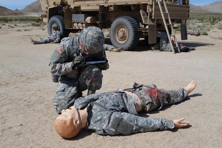 | Keywords: weed army community hospital weedarmycommunityhospital wach national training center nationaltrainingcenter ntc fort irwin fortirwin california col. jason wieman coljasonwieman command sgt maj. albert harris commandsgtmajalbertharris 2916th aviation battalion 2916thaviationbattalion emergency medical care emergencymedicalcare meddac rhc-c rhcc patient care patientcare soldier readiness soldierreadiness army training armytraining medical evacuation medicalevacuation medevac capt. sean donohue captseandonohue outdoor FORT IRWIN, Calif. -- The 2916th Aviation Battalion utilized an off-cycle window in their calendar March 20 - 23 to conduct brigade-level training in the National Training Center's "Box". The exercise culminated at the Fort Irwin Weed Army Community Hospital (WACH) March 23. The goal of the training is to test readiness as well as hone emergency medical skills among the participating service members. One simulation presented the participants with an Improvised Explosive Device (IED) attack on a troop transport that resulted in 16 casualties. The role players required triage at the point of injury in the training area, then airlifted back to the WACH on Fort Irwin for treatment. This was a large-scale training module that involved complex planning. To make the exercise as authentic as possible training units had no warning of what they would encounter throughout the course of the event and participants were alerted only as the scenario unfolded, just as if the casualties and events were real. Large casualty events of this kind take a special type of planning coordination, material and geography to execute, and even more consideration to undertake, which makes the NTC an ideal venue for such training. The 2916th assumed the role of air medevac, requiring multiple airlifts to bring all casualties back to the WACH, where staff members prioritized, stabilized and treated the mock casualties, then prepared to fly any they determined needing specialized care beyond WACH capabilities to other nearby available medical facilities for more extensive treatment. To learn more about the people and facilities of the National Training Center and the Weed Army Community Hospital visit their official websites at www.irwin.army.mil or www.irwin.amedd.army.mil Photo by Captain Sean Donoghue for WACH Public Affairs (Released), FORT IRWIN, Calif. -- The 2916th Aviation Battalion utilized an off-cycle window in their calendar March 20 - 23 to conduct brigade-level training in the National Training Center's "Box". The exercise culminated at the Fort Irwin Weed Army Community Hospital (WACH) March 23. The goal of the training is to test readiness as well as hone emergency medical skills among the participating service members. One simulation presented the participants with an Improvised Explosive Device (IED) attack on a troop transport that resulted in 16 casualties. The role players required triage at the point of injury in the training area, then airlifted back to the WACH on Fort Irwin for treatment. This was a large-scale training module that involved complex planning. To make the exercise as authentic as possible training units had no warning of what they would encounter throughout the course of the event and participants were alerted only as the scenario unfolded, just as if the casualties and events were real. Large casualty events of this kind take a special type of planning coordination, material and geography to execute, and even more consideration to undertake, which makes the NTC an ideal venue for such training. The 2916th assumed the role of air medevac, requiring multiple airlifts to bring all casualties back to the WACH, where staff members prioritized, stabilized and treated the mock casualties, then prepared to fly any they determined needing specialized care beyond WACH capabilities to other nearby available medical facilities for more extensive treatment. To learn more about the people and facilities of the National Training Center and the Weed Army Community Hospital visit their official websites at www.irwin.army.mil or www.irwin.amedd.army.mil Photo by Captain Sean Donoghue for WACH Public Affairs (Released), |