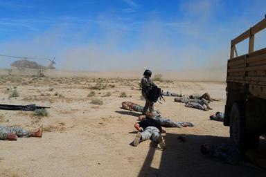 | Keywords: weed army community hospital weedarmycommunityhospital wach national training center nationaltrainingcenter ntc fort irwin fortirwin california col. jason wieman coljasonwieman command sgt maj. albert harris commandsgtmajalbertharris 2916th aviation battalion 2916thaviationbattalion emergency medical care emergencymedicalcare meddac rhc-c rhcc patient care patientcare soldier readiness soldierreadiness army training armytraining medical evacuation medicalevacuation medevac capt. sean donohue captseandonohue outdoor FORT IRWIN, Calif. -- The 2916th Aviation Battalion utilized an off-cycle window in their calendar March 20 - 23 to conduct brigade-level training in the National Training Center's "Box". The exercise culminated at the Fort Irwin Weed Army Community Hospital (WACH) March 23. The goal of the training is to test readiness as well as hone emergency medical skills among the participating service members. One simulation presented the participants with an Improvised Explosive Device (IED) attack on a troop transport that resulted in 16 casualties. The role players required triage at the point of injury in the training area, then airlifted back to the WACH on Fort Irwin for treatment. This was a large-scale training module that involved complex planning. To make the exercise as authentic as possible training units had no warning of what they would encounter throughout the course of the event and participants were alerted only as the scenario unfolded, just as if the casualties and events were real. Large casualty events of this kind take a special type of planning coordination, material and geography to execute, and even more consideration to undertake, which makes the NTC an ideal venue for such training. The 2916th assumed the role of air medevac, requiring multiple airlifts to bring all casualties back to the WACH, where staff members prioritized, stabilized and treated the mock casualties, then prepared to fly any they determined needing specialized care beyond WACH capabilities to other nearby available medical facilities for more extensive treatment. To learn more about the people and facilities of the National Training Center and the Weed Army Community Hospital visit their official websites at www.irwin.army.mil or www.irwin.amedd.army.mil Photo by Captain Sean Donoghue for WACH Public Affairs (Released), FORT IRWIN, Calif. -- The 2916th Aviation Battalion utilized an off-cycle window in their calendar March 20 - 23 to conduct brigade-level training in the National Training Center's "Box". The exercise culminated at the Fort Irwin Weed Army Community Hospital (WACH) March 23. The goal of the training is to test readiness as well as hone emergency medical skills among the participating service members. One simulation presented the participants with an Improvised Explosive Device (IED) attack on a troop transport that resulted in 16 casualties. The role players required triage at the point of injury in the training area, then airlifted back to the WACH on Fort Irwin for treatment. This was a large-scale training module that involved complex planning. To make the exercise as authentic as possible training units had no warning of what they would encounter throughout the course of the event and participants were alerted only as the scenario unfolded, just as if the casualties and events were real. Large casualty events of this kind take a special type of planning coordination, material and geography to execute, and even more consideration to undertake, which makes the NTC an ideal venue for such training. The 2916th assumed the role of air medevac, requiring multiple airlifts to bring all casualties back to the WACH, where staff members prioritized, stabilized and treated the mock casualties, then prepared to fly any they determined needing specialized care beyond WACH capabilities to other nearby available medical facilities for more extensive treatment. To learn more about the people and facilities of the National Training Center and the Weed Army Community Hospital visit their official websites at www.irwin.army.mil or www.irwin.amedd.army.mil Photo by Captain Sean Donoghue for WACH Public Affairs (Released), |