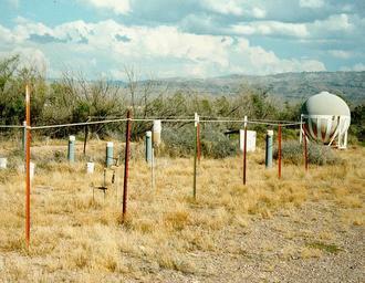 | Keywords: NTS - Cambric Research Site.jpg Cambric Research Site located to the west of 5-01 Short Pole Road south of 5-07 Road in the Nevada Test Site A 750-ton underground nuclear test named Cambric was conducted in alluvium sand and gravel at this site on May 14 1965 A companion test Cheshire was conducted on Pahute Mesa volcanics on February 14 1976 Both were conducted for special studies into the movement of groundwater For the Cambric test scientists drilled a well 300 feet from the ground zero and during a period of 16 years pumped four billion gallons of water to force radioactive elements to move out of the cavity made by the Cambric test It took two years of continuous pumping to move tritium 300 feet from the cavity to the well Although 98 percent of the tritium concentration was in the Cambric cavity the maximum level ever detected at the sample well was less than a tenth of a percent Radioactive elements such as strontium-90 cesium-137 plutonium and uranium were never detected during pumping activities Nevada Test Site Guide http //www nv energy gov/library/publications/historical/DOENV_715_Rev1 pdf DOE/NV-715 Federal Government of the United States PD-USGov Frenchman Flat Whetstone Cambric |
