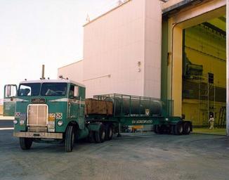 | Keywords: NTS - EMAD Facility 005.jpg en Nevada Test Site - Nuclear Rocket Development Station A truck at the E-MAD building in Area 25 of the Nevada Test Site trucks brought the spent fuel rods from the Turkey Point reactor in Florida The fuel rods were remotely encapsulated in stainless steel canisters remotely welded shut and stored for transport in the Climax facility for underground radioactive waste storage investigations in granite 1018 WA-368 Federal Government of the United States 36 806459 -116 304649 PD-USGov NRDS E-MAD White-Freightliner WFT / Freightliner FLT Transport of nuclear waste containers Green trucks |
