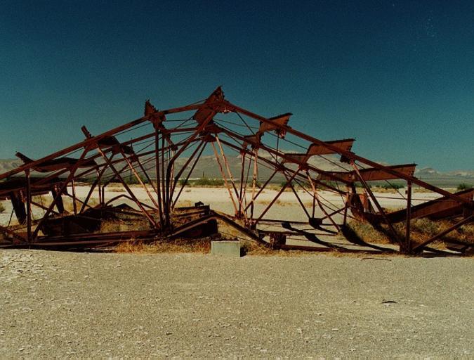 Keywords: NTS - Full-Scale Industrial Buildings - After.jpg Drag type Butler building as it looks today <br /> Four such structures were built for the Met Military Effects Test test Two were of the drag type the roofing and siding were fragile/breakable corrugated asbestos sheets Two were of the semi-drag type buildings with reinforced concrete side walls and corrugated asbestos roofing All four had the same steel frames 30 feet in overhead height and spans of 40 feet The two drag type buildings were located 3 600 and 4 350 feet from ground zero and the two semi-drag structures were 5 000 and 5 750 feet from ground zero The four buildings were modified for the 1957 Priscilla test Nevada Test Site Guide http //www nv energy gov/library/publications/historical/DOENV_715_Rev1 pdf DOE/NV-715 Federal Government of the United States PD-USGov Frenchman Flat |