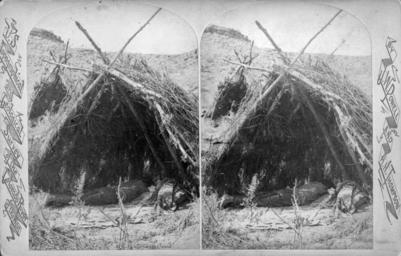 | Keywords: Nu-nu-shi-unt, the dreamer.jpg An unidentified Native American Paiute man sleeps on blankets inside of a wickiup; a small hut of branches over interlocking poles and an open side southern Utah Label on print Indians of the Colorado Valley No 43 U-ai nu-ints A tribe of Indians living on the Rio Virgen a tributary of the Colorado in Southern Utah Entered according to Act of Congress in the year 1874 by J W Powell in the Office of the Librarian of Congress at Washington Published by Wm B Holmes 646 Broadway New York 1874 http //digital denverlibrary org/cdm/ref/collection/p15330coll22/id/25644 Hillers John K 1843-1925 1925 Wigwam or Wickiup Paiute 1874 in Utah Stereo cards of Utah Black and white photographs of Utah John K Hillers Sleeping |