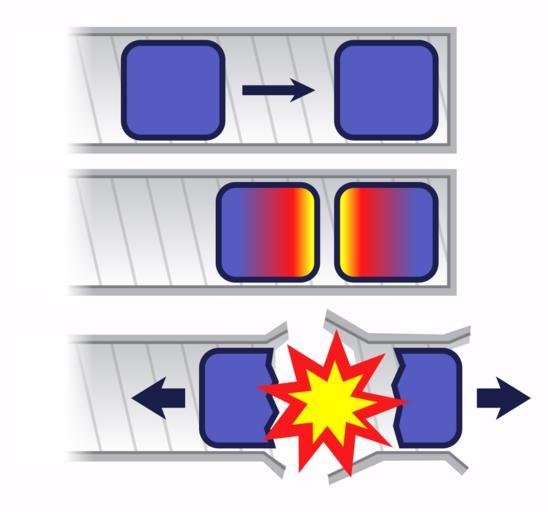 | Keywords: Nuclear predetonation.svg Diagram illustrating nuclear predetonation fizzle in a very-schematic gun-type setup At the top a piece of fissile material i e enriched uranium is accelerated towards another piece to create a critical mass However because the acceleration is too slow stray neutrons caused by spontaneous fissioning cause the surfaces of the two pieces to begin to react before a full critical mass is formed middle Because of this a small explosion results destroying the containment apparatus and sending the bulk of the material which did not fission away from itself preventing further nuclear reaction This explosion would be much smaller than a full nuclear explosion and result in the dispersal of expensive nuclear material Created by User Fastfission with Inkscape Created with Inkscape Fastfission If you want to credit someone credit Wikimedia Commons Otherwise don't credit anyone that's fine by me --Fastfission 15 13 14 April 2008 UTC Nuclear weapon schemas |