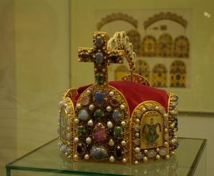 Keywords: Nuernberg Rathaus Reichskleinodien Reichskrone 001.JPG Reichskrone Repliken der Reichskleinodien im Nürnberger Rathaus own Janericloebe 2009-09 Imperial Crown of the Holy Roman Empire Town Hall of Nuremberg
