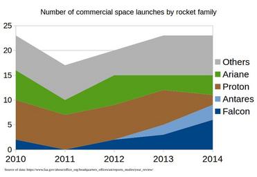 | Keywords: Number of commercial space launches by rocket family.png en Number of commercial space launches by rocket family Source of the data https //www faa gov/about/office_org/headquarters_offices/ast/reports_studies/year_review/ Federal Aviation Administration Commercial Space Transportation Year in Review <br> Commercial launch is https //www faa gov/about/office_org/headquarters_offices/ast/media/2006YIR pdf defined by the FAA as a launch that is internationally competed or FAA-licensed or privately-financed launch activity Demonstration launches are not counted <br> In the others category are Dnepr PSLV Soyuz Zenit Atlas Delta Minotaur Rockot and Long March families None of them made more than 2 commercial launches in 2014 see the data section below ru ΠΠ·ΠΌΠ΅Π½Π΅Π½ΠΈΡ Π½Π° Ρ ΡΠ½ΠΊΠ΅ ΠΊΠΎΠΌΠΌΠ΅Ρ ΡΠ΅ΡΠΊΠΈΡ